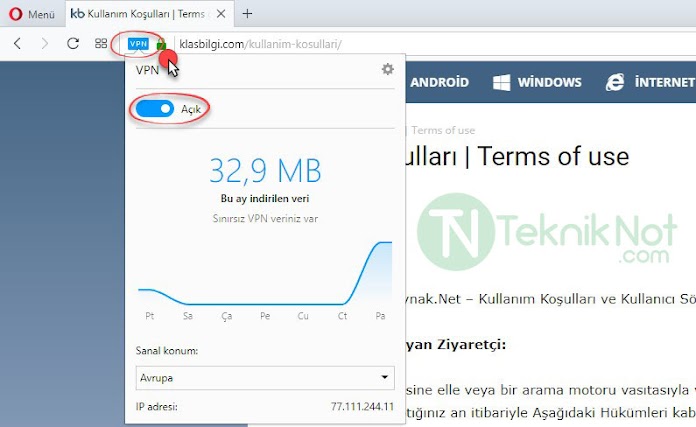 Böylece adres çubuğunun solunda VPN işareti belirecektir. Artık Opera VPN’i kullanmaya hazırsınız. Daha sonra aşağıdaki resimde olduğu gibi VPN butonuna tıklayarak istediğiniz zaman VPN etkinleştirip devre dışı bırakabilirsiniz.