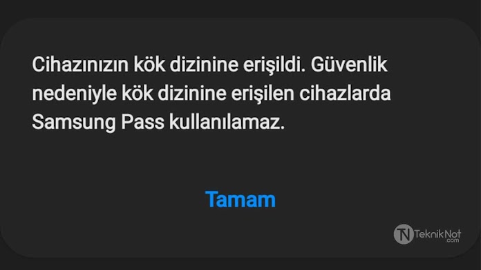 Cihazınızın kök dizinine erişildi. Güvenlik nedeniyle kök dizinine erişilen cihazlarda Samsung Pass kullanılamaz.