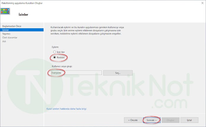 - Aşağıdaki ekranda Reddet ve Everyone seçeneği seçinve Sonraki > butonuna tıklayarak devam edin.